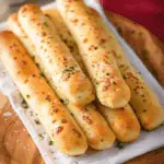 For cheesy breadsticks, sprinkle parmesan or mozzarella before baking.Add Italian seasoning or herbs to garlic butter for extra flavor.Use half whole wheat flour for a healthier version.Freeze shaped dough after first rise to bake later.Reheat leftovers in oven wrapped in foil to maintain softness.