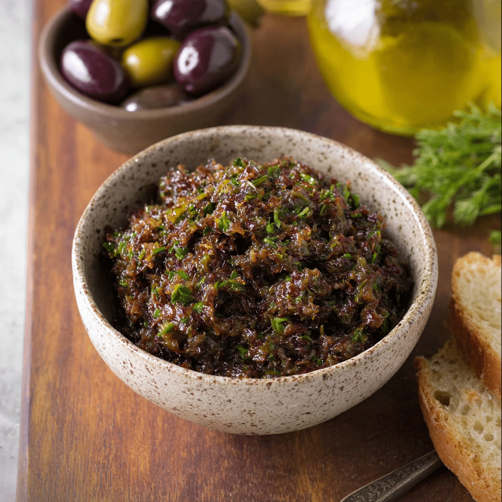 Olive tapenade is a Mediterranean spread made primarily from olives, capers, garlic, and olive oil blended into a coarse paste.