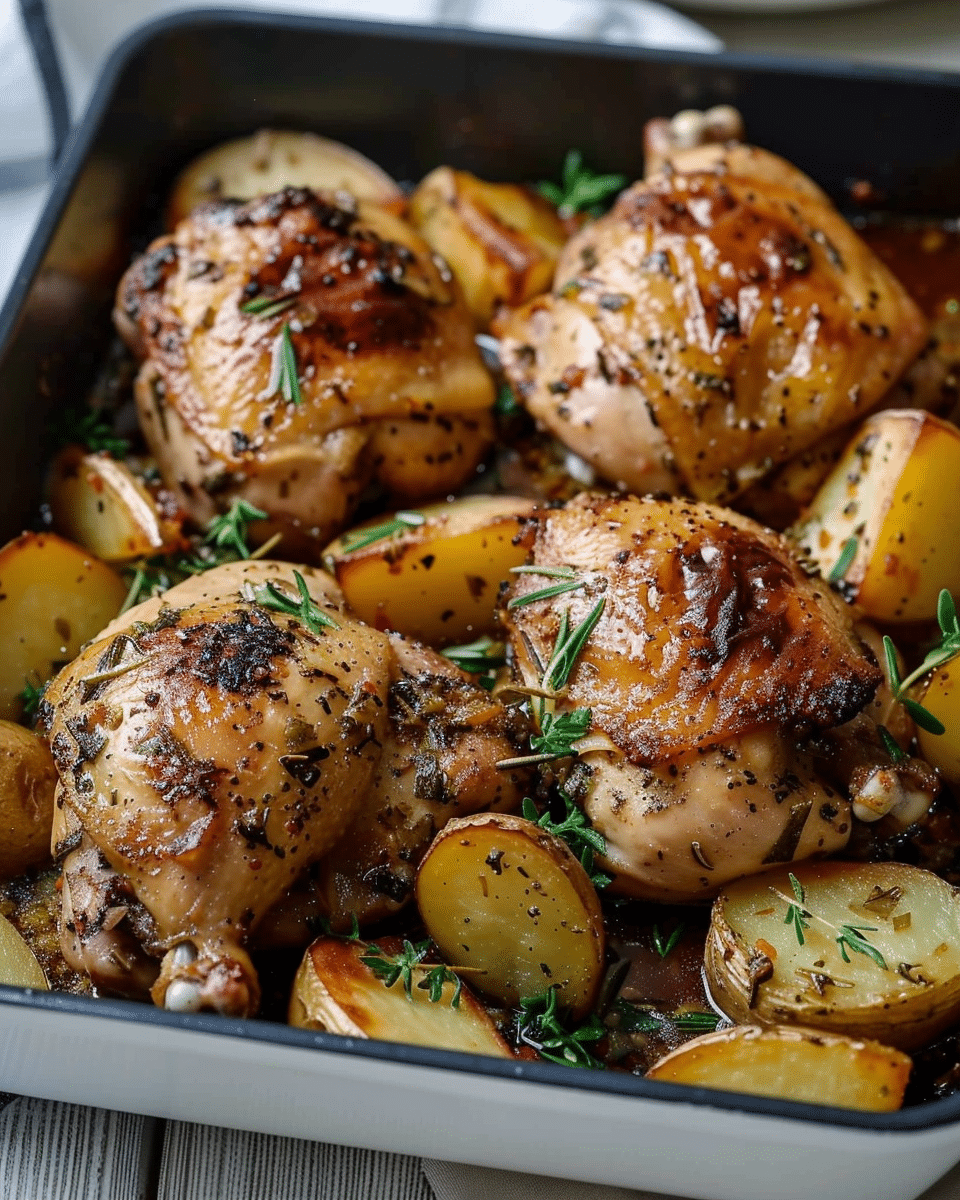 This recipe is the perfect balance of hearty and hassle-free. The chicken turns out juicy with a crispy skin, and the potatoes are roasted to golden perfection, absorbing the savory juices from the chicken as they cook. Everything cooks together in one pan, making cleanup a breeze. Plus, it’s endlessly customizable with your favorite herbs, spices, or vegetables.