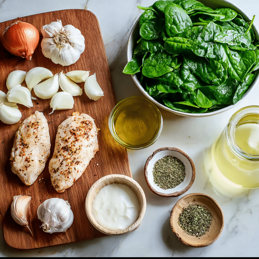 (Tip: You’ll find the full list of ingredients and measurements in the recipe card below.) chicken breast or thighs olive oil or butter garlic onion fresh spinach heavy cream chicken broth parmesan cheese salt black pepper italian seasoning nutmeg (optional) flour (optional, for thickening)
