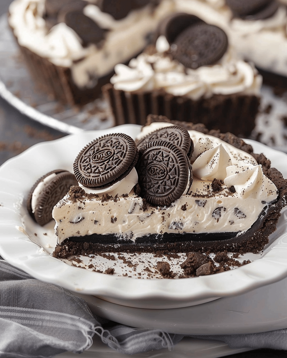 Top with crushed Oreos: Before serving, sprinkle the top of the pie with the remaining crushed Oreos for added crunch and decoration.