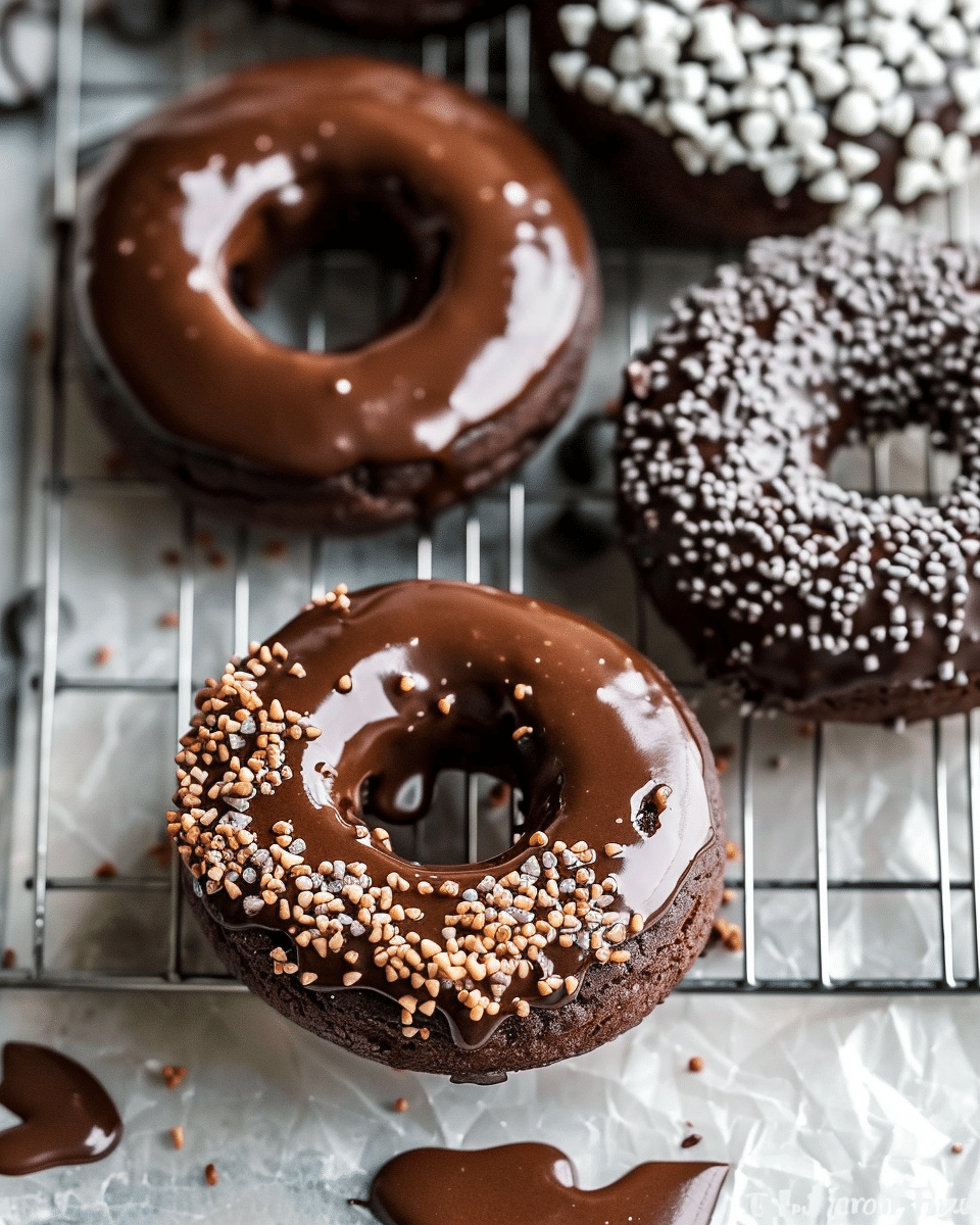 Add cinnamon or espresso powder for extra flavor depth.Top with shredded coconut, chopped nuts, or freeze-dried berries before the glaze sets.Use a mini donut pan for smaller donuts (reduce baking time by 3–4 minutes).Store at room temperature for 2 days, in the fridge for 5 days, or freeze (unglazed) for 2 months.Reheat in oven at 300°F for 5 minutes or microwave 15–20 seconds.
