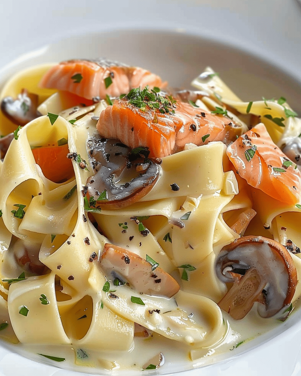 This Pappardelle with Salmon and Shiitake Mushrooms brings together a delightful mix of flavors and textures. The creamy sauce binds the dish together while allowing the richness of the salmon and the umami of the shiitake mushrooms to shine through. The pappardelle, with its broad, soft ribbons, is the perfect base for this combination, creating a hearty and satisfying meal. Whether you’re making it for a special occasion or a weeknight dinner, this dish is sure to impress!