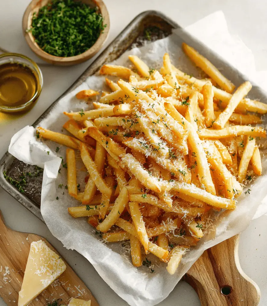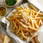 Parmesan Truffle Fries are crispy baked fries tossed with aromatic truffle oil, freshly grated parmesan cheese, and herbs. This easy parmesan truffle fries recipe creates a gourmet-style side dish with golden crispy potatoes and rich savory flavor, perfect for burgers, sandwiches, or as a delicious appetizer.