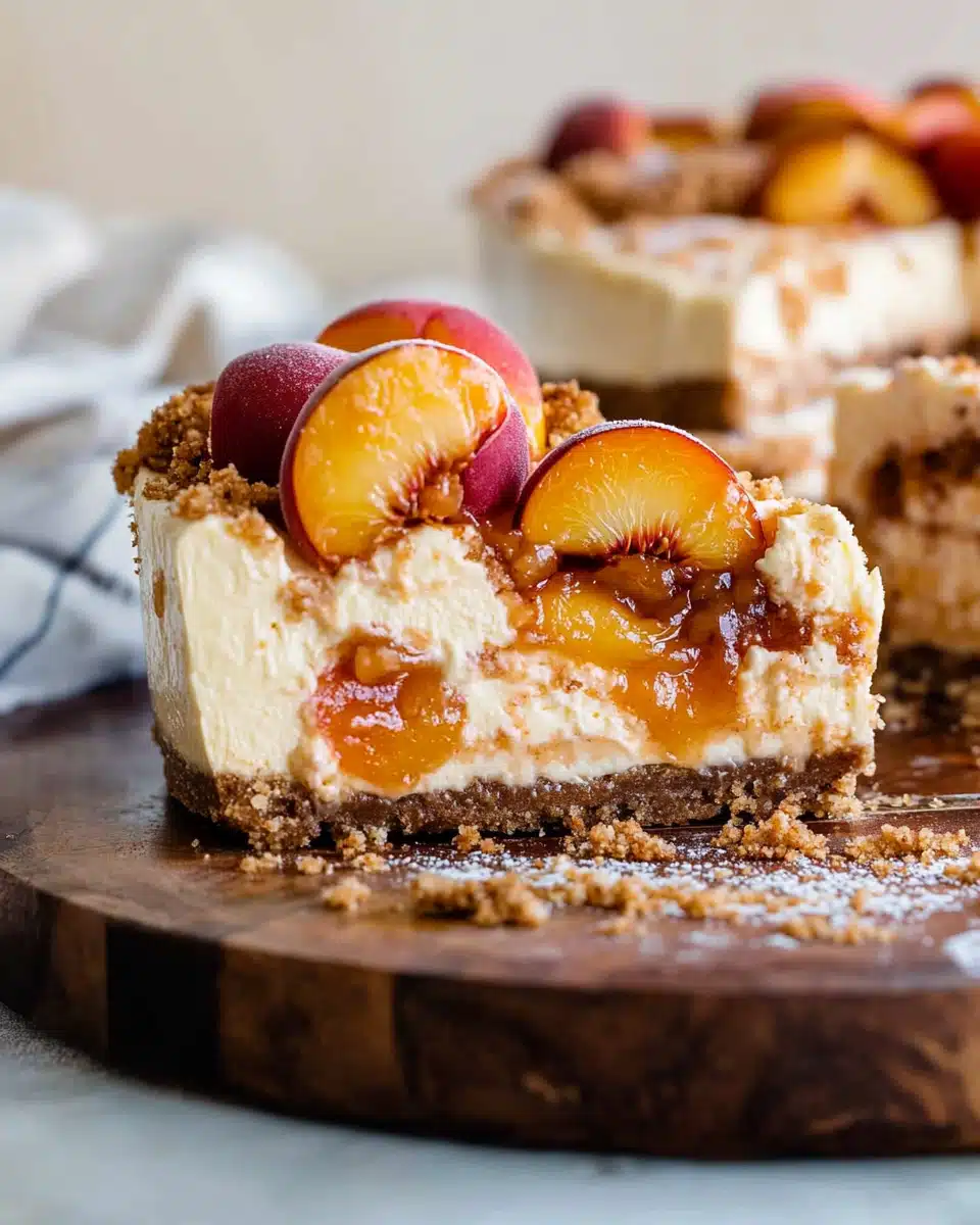 - Top and serve: Before serving, top the cheesecake with the remaining roasted peaches and reserved crumble. Let sit for 20–30 minutes at room temperature before serving.