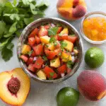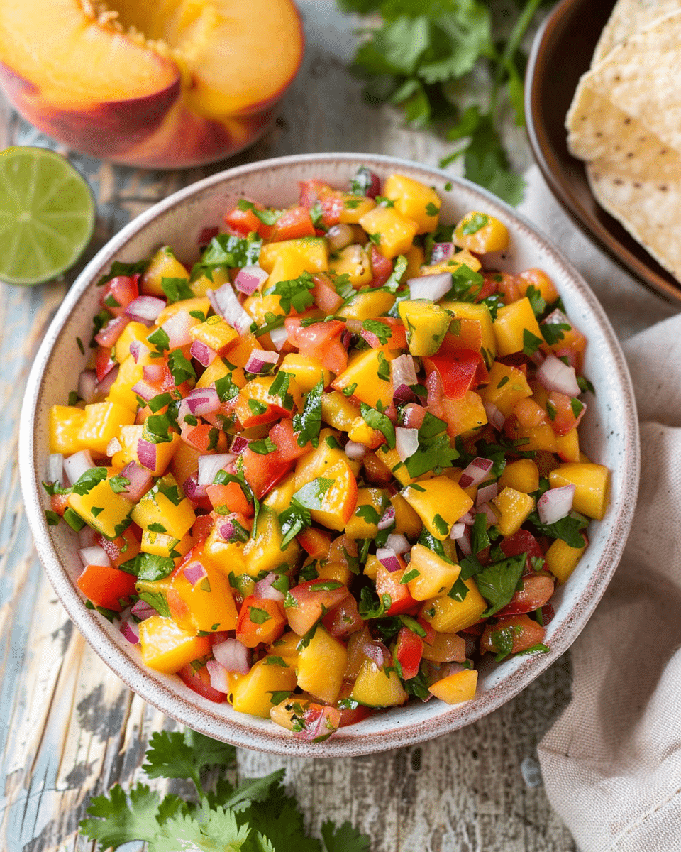Peach Salsa is a bright, fresh condiment made with sweet ripe peaches, crisp vegetables, lime juice, and herbs. It’s a perfect summer dip or topping that combines sweet, spicy, and tangy flavors in one vibrant dish.