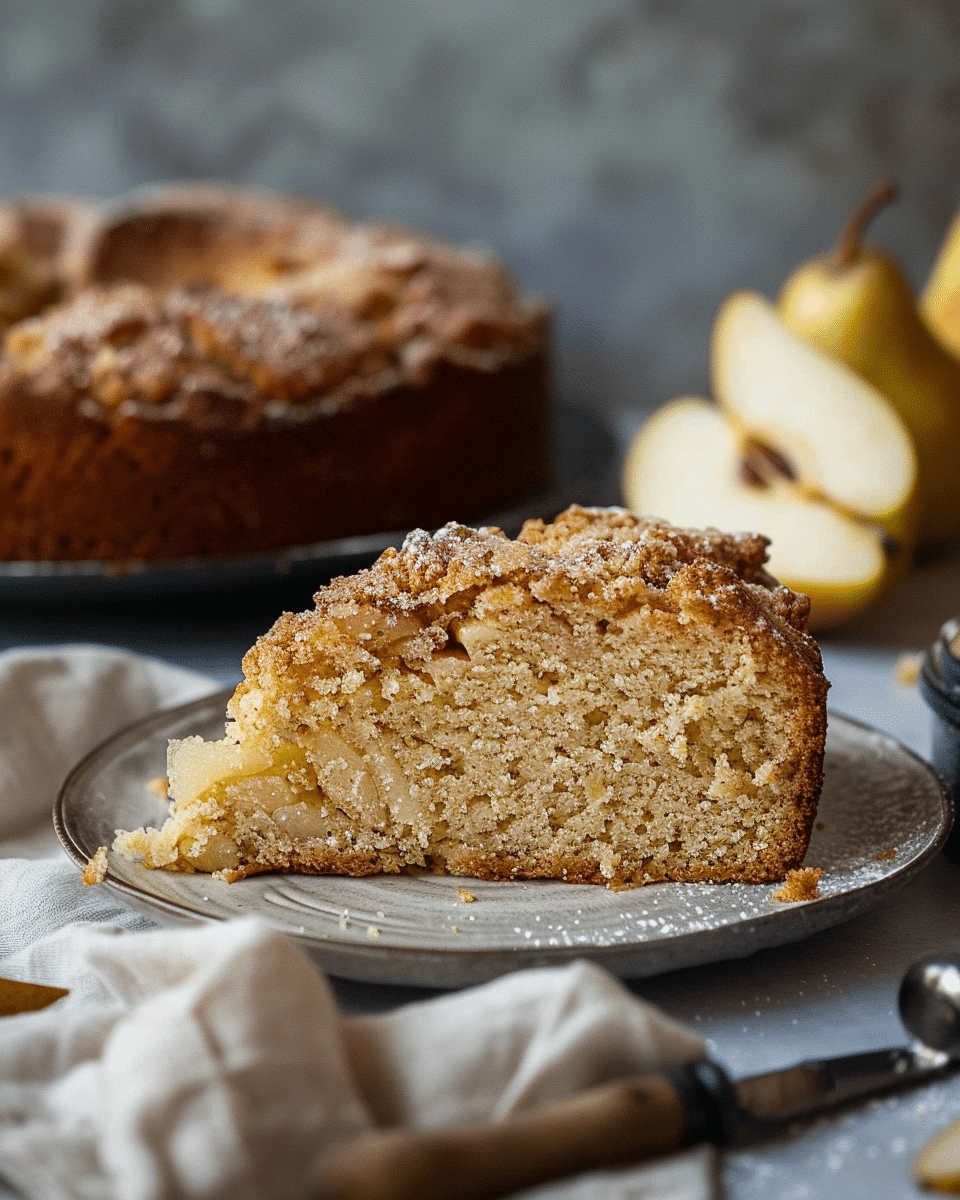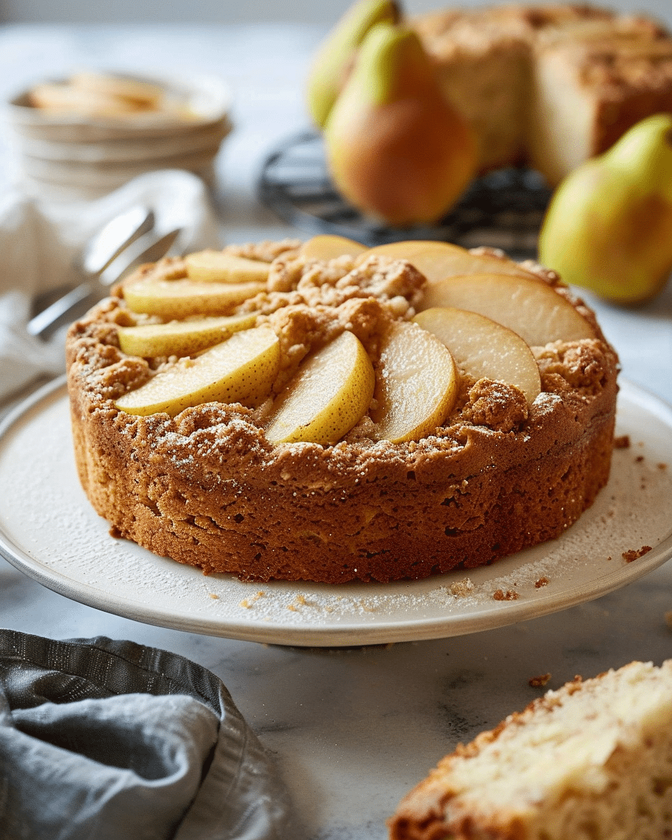 Use firm but ripe pears like Bosc, Anjou, or Bartlett for best texture.Substitute half of the flour with almond or whole wheat flour for variation.Add warm spices like nutmeg, ginger, or cardamom for more depth.Can be made a day ahead and stored covered at room temperature or refrigerated.To freeze, wrap slices individually and thaw at room temperature before serving.