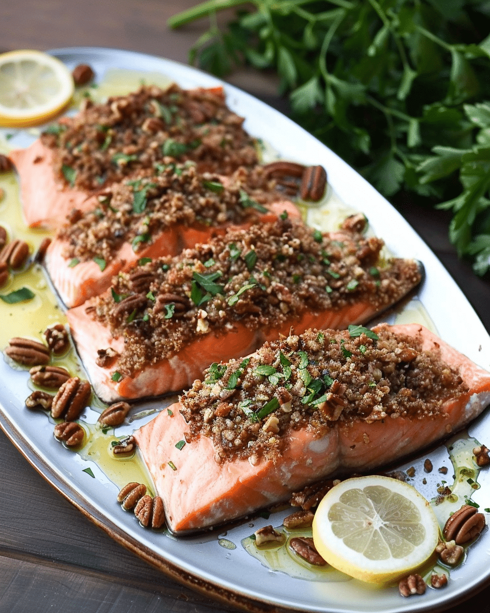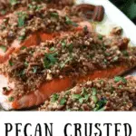 Bake for 12–15 minutes, or until the salmon flakes easily with a fork and the pecan crust is golden and toasted.