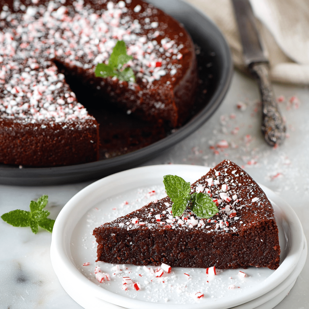 Use high-quality dark chocolate for the richest flavor.Peppermint extract is strong, so measure carefully to avoid overpowering the chocolate.The cake will firm up as it cools, giving it a dense, truffle-like texture.Serve with whipped cream or chocolate ganache for an elegant presentation.