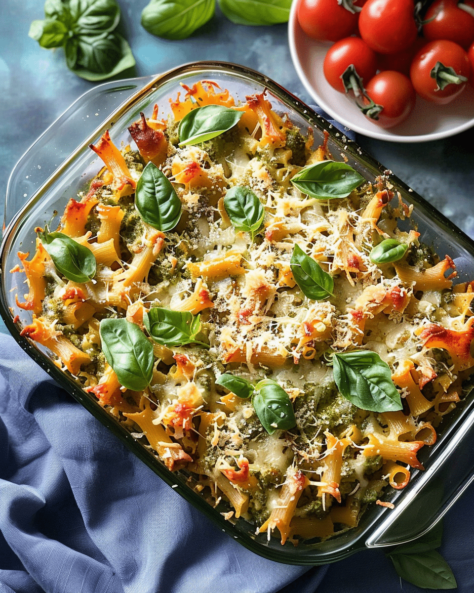 Pesto Pasta Bake is a cheesy and comforting casserole made with pasta tossed in basil pesto, layered with mozzarella, Parmesan, and fresh veggies, then baked until golden and bubbly. It’s quick, flavorful, and perfect for family dinners or meal prep.