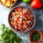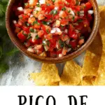 This Pico de Gallo recipe is a fresh and vibrant Mexican salsa made with diced tomatoes, onion, cilantro, jalapeño, and zesty lime juice. Quick to prepare and packed with bright flavors, homemade pico de gallo is perfect as a dip with tortilla chips or as a topping for tacos, grilled meats, burritos, and more.