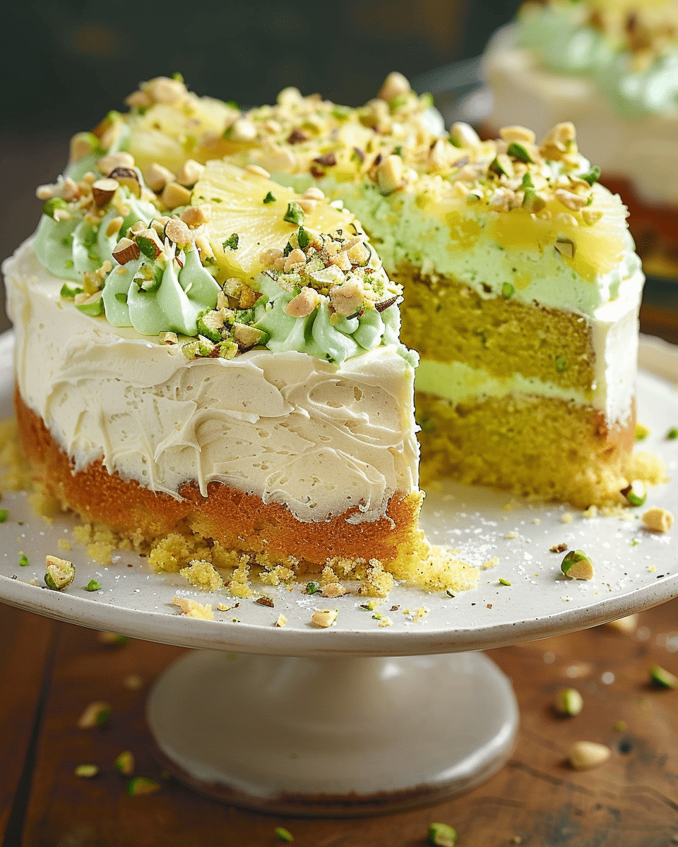 Pistachio Pineapple Paradise Cake is a tropical-inspired dessert made with boxed cake mix, pistachio pudding, and crushed pineapple. Topped with whipped topping and optional garnishes, it’s moist, fruity, and irresistibly light—perfect for gatherings and summer treats.