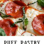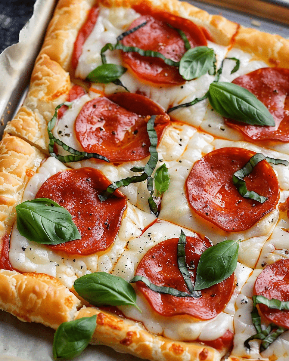 Use a light layer of sauce and avoid overly wet toppings to maintain a crisp crust.Pricking the center of the puff pastry prevents excessive puffing and helps it bake evenly.Reheat leftovers in an oven or toaster oven for best texture—avoid microwaving.Customize with different sauces (BBQ, garlic cream) and cheeses (provolone, goat cheese).Make it vegetarian by using only plant-based toppings.
