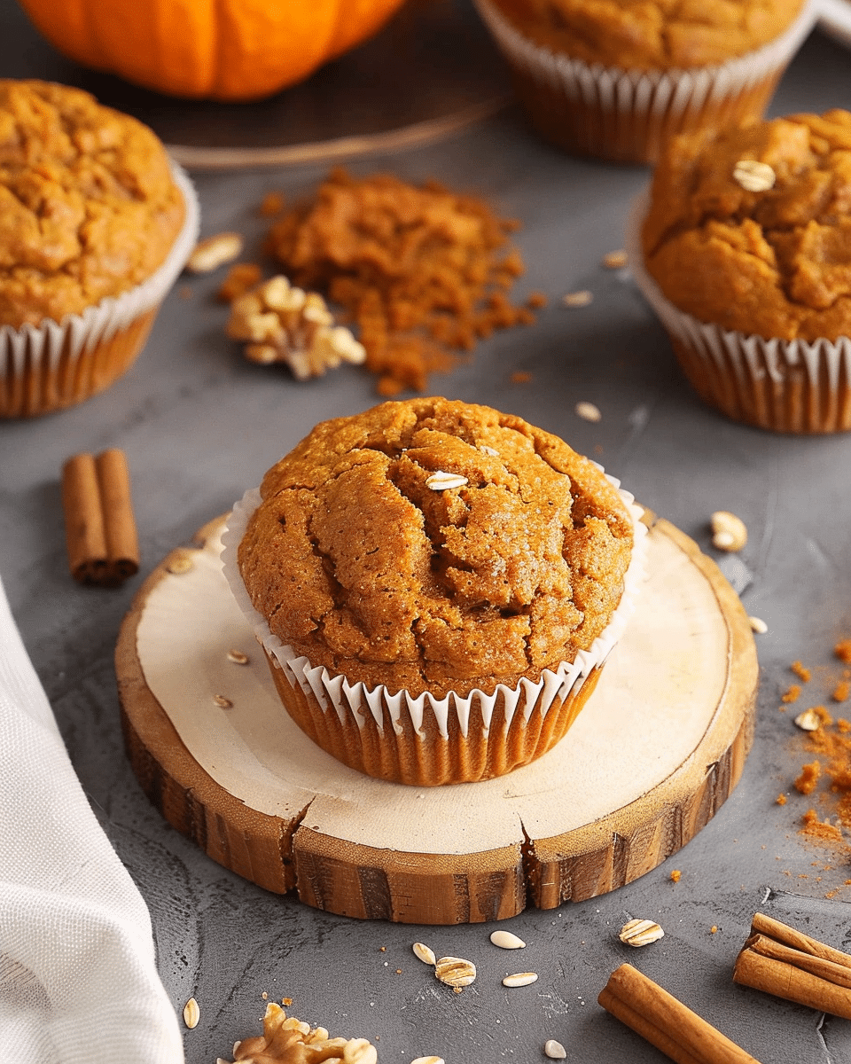 Use flax eggs and plant-based yogurt for a vegan version.Swap oats with almond flour for a lower-carb option.Add pumpkin spice or cloves for extra warmth.Store muffins in the fridge up to 1 week or freeze for up to 3 months.Do not use pumpkin pie filling—only pure pumpkin puree.