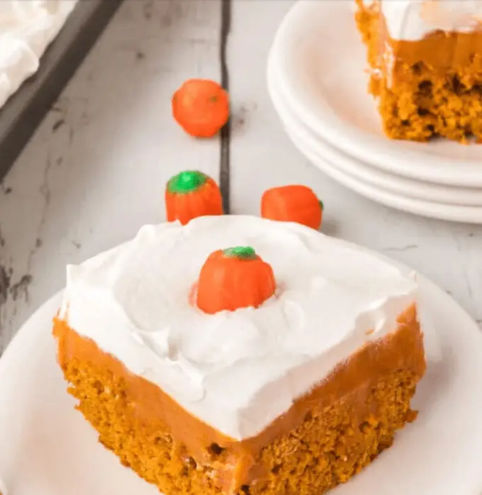 Pumpkin Spice Poke Cake is a moist and fluffy dessert infused with pumpkin, warm spices, and a creamy caramel filling. Topped with a light whipped topping and a sprinkle of cinnamon, this cake is the perfect fall dessert for gatherings, potlucks, and holidays.