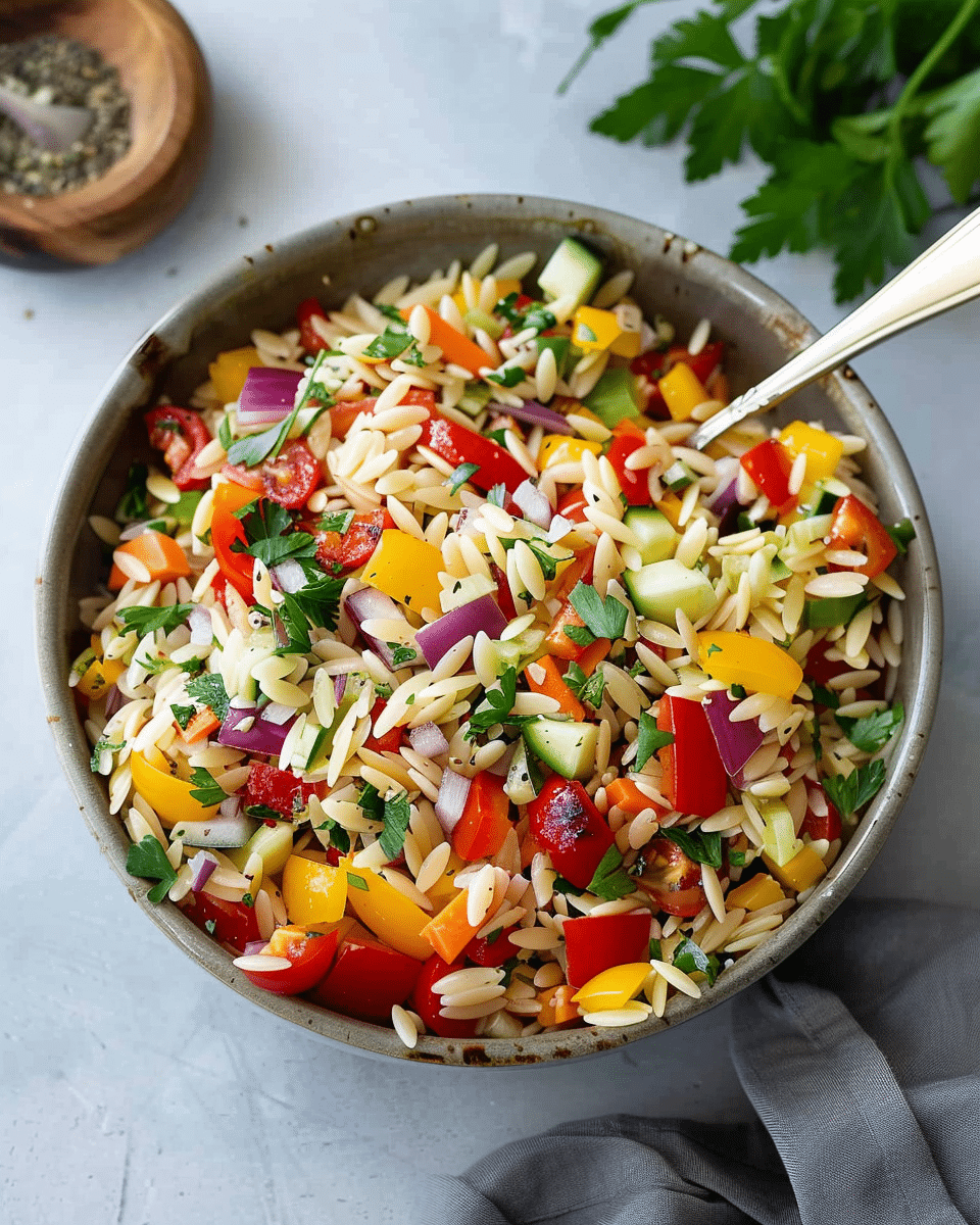 Rainbow Orzo Salad is a vibrant, refreshing dish that combines tender orzo pasta with colorful vegetables, fresh herbs, and a zesty lemon vinaigrette. This dish is perfect as a side, a light main course, or for meal prepping, offering a nutritious and customizable option for any occasion.