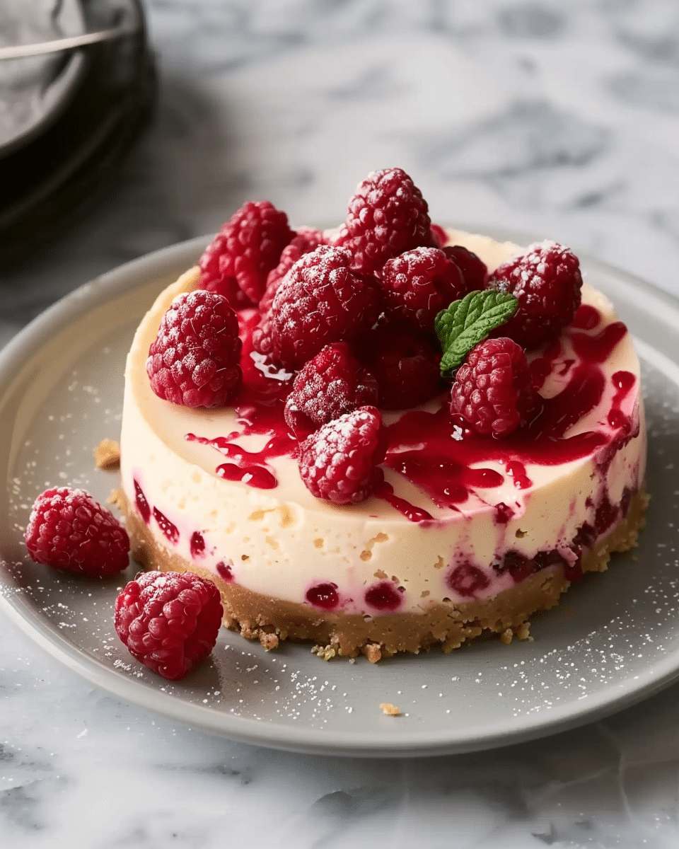 Assemble the Cheesecake: Once the cheesecake is fully chilled, remove from the springform pan. Spoon the raspberry topping over the cheesecake and swirl or drizzle it in a decorative pattern.
