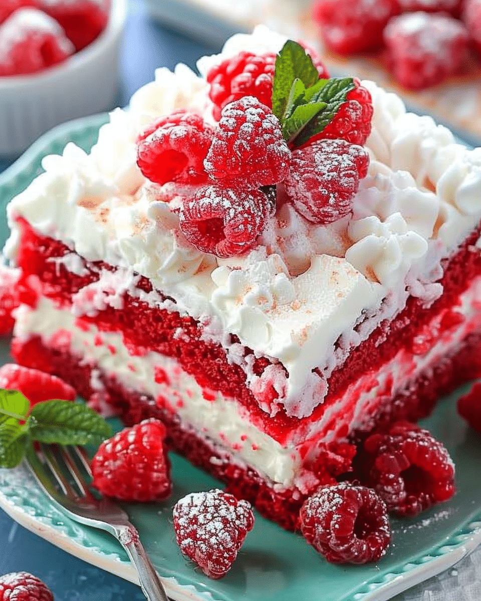 This cake is incredibly easy to assemble and perfect for making ahead of time. The poke cake technique ensures every bite is moist and bursting with raspberry flavor. It’s a great dessert for potlucks, picnics, birthdays, or any time you want to serve something fun, fruity, and a little retro. Best of all, it uses simple ingredients and requires minimal baking skills.