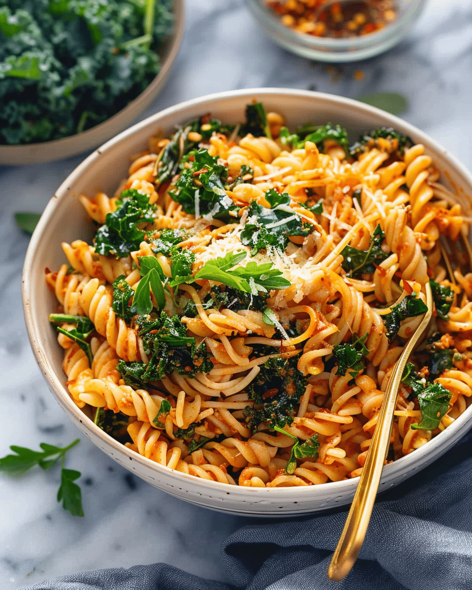 This Red Pesto Pasta with Chili Kale is a perfect combination of bold, savory, and slightly spicy flavors that will awaken your taste buds. The red pesto sauce, made with sun-dried tomatoes, nuts, garlic, and olive oil, offers a rich depth of flavor that coats every strand of pasta. The chili kale adds a wonderful heat and texture that complements the pesto, while also providing a nutritious boost. Whether you’re making this for a weeknight dinner or a special meal, this recipe will quickly become a favorite for its simplicity and satisfying taste.