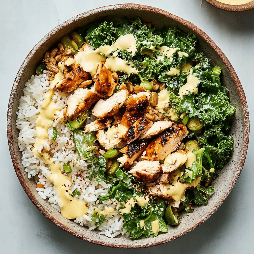 This recipe is a complete meal in one bowl, making it both convenient and nourishing. The juicy chicken pairs perfectly with the slightly crisp kale and fluffy rice, while the creamy sauce ties everything together with a smooth, savory finish.