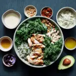 Assemble bowls with rice as the base, then add sliced chicken and kale.