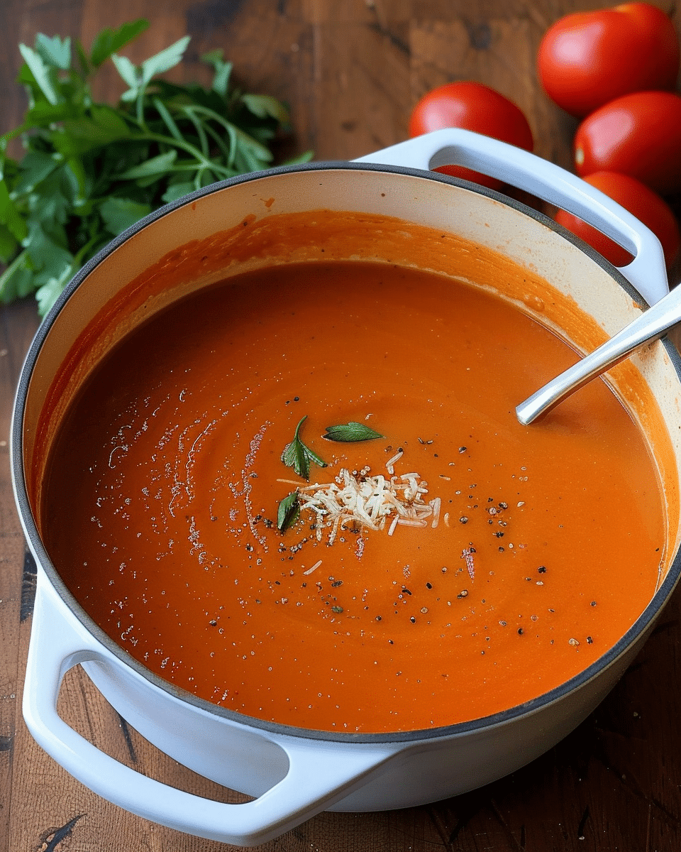 Serve: Ladle hot soup into bowls and garnish with fresh basil, a drizzle of cream, or a sprinkle of Parmesan if desired.