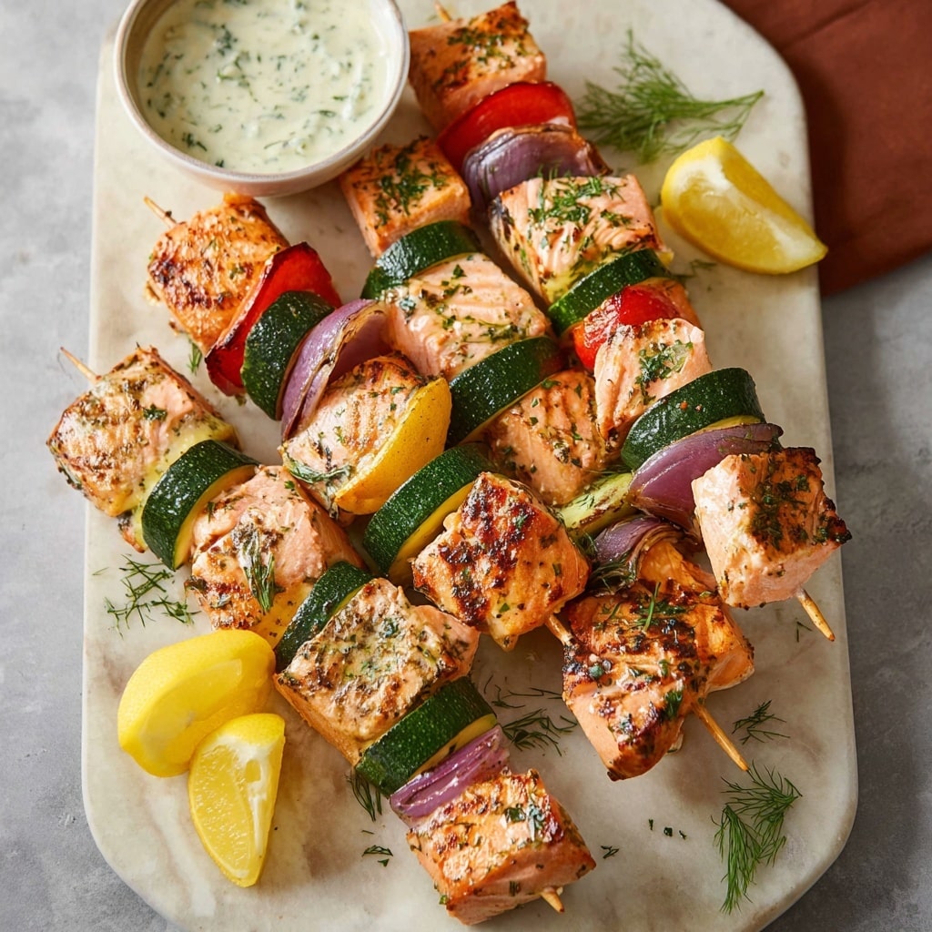 Use shrimp or chicken instead of salmon for a protein variation.Add cherry tomatoes, mushrooms, or pineapple for extra flavor and color.Can be baked in the oven at 400°F (200°C) for 12–15 minutes if grilling is not an option.Store leftovers in the fridge for up to 3 days and reheat in the oven or skillet for best texture.