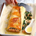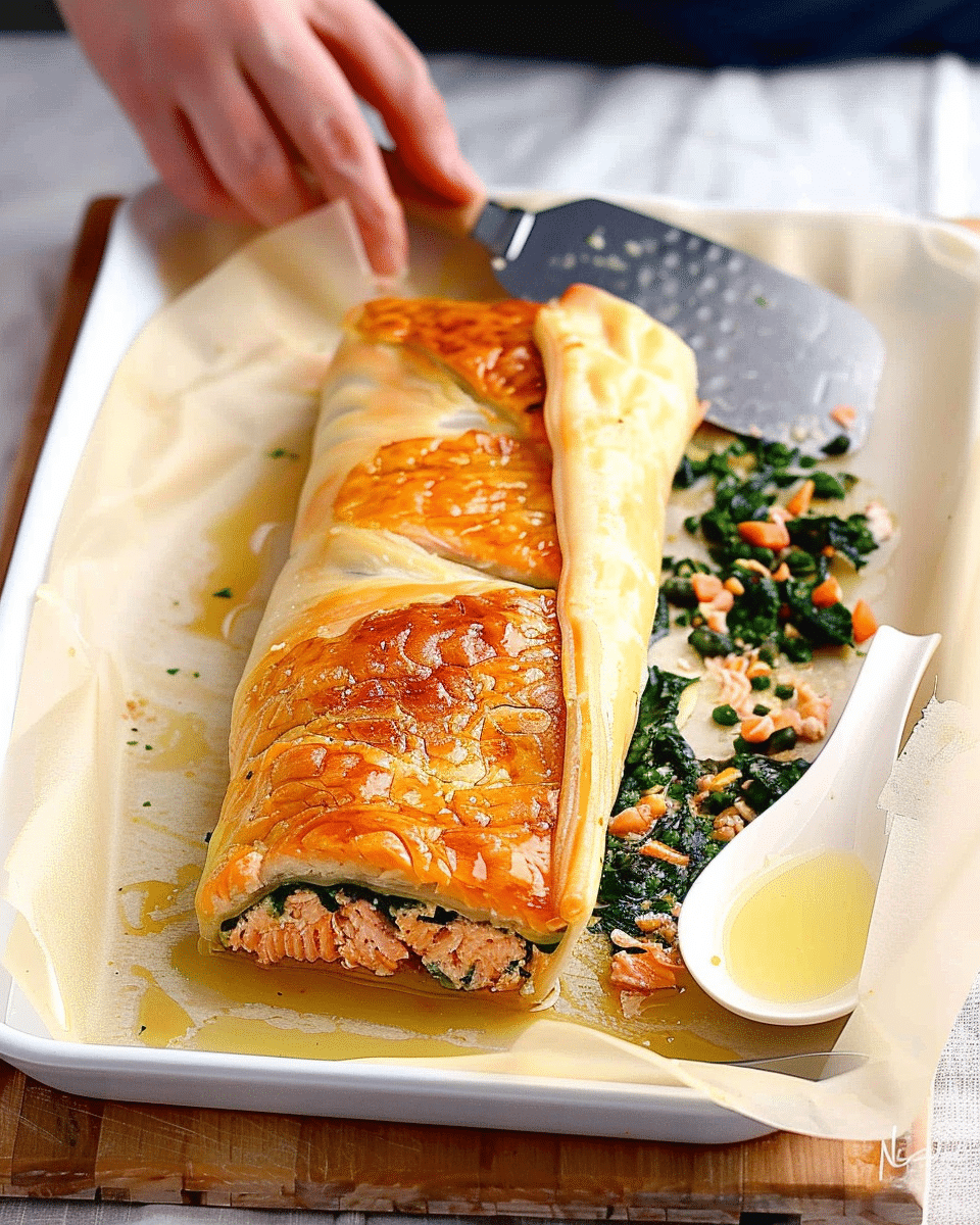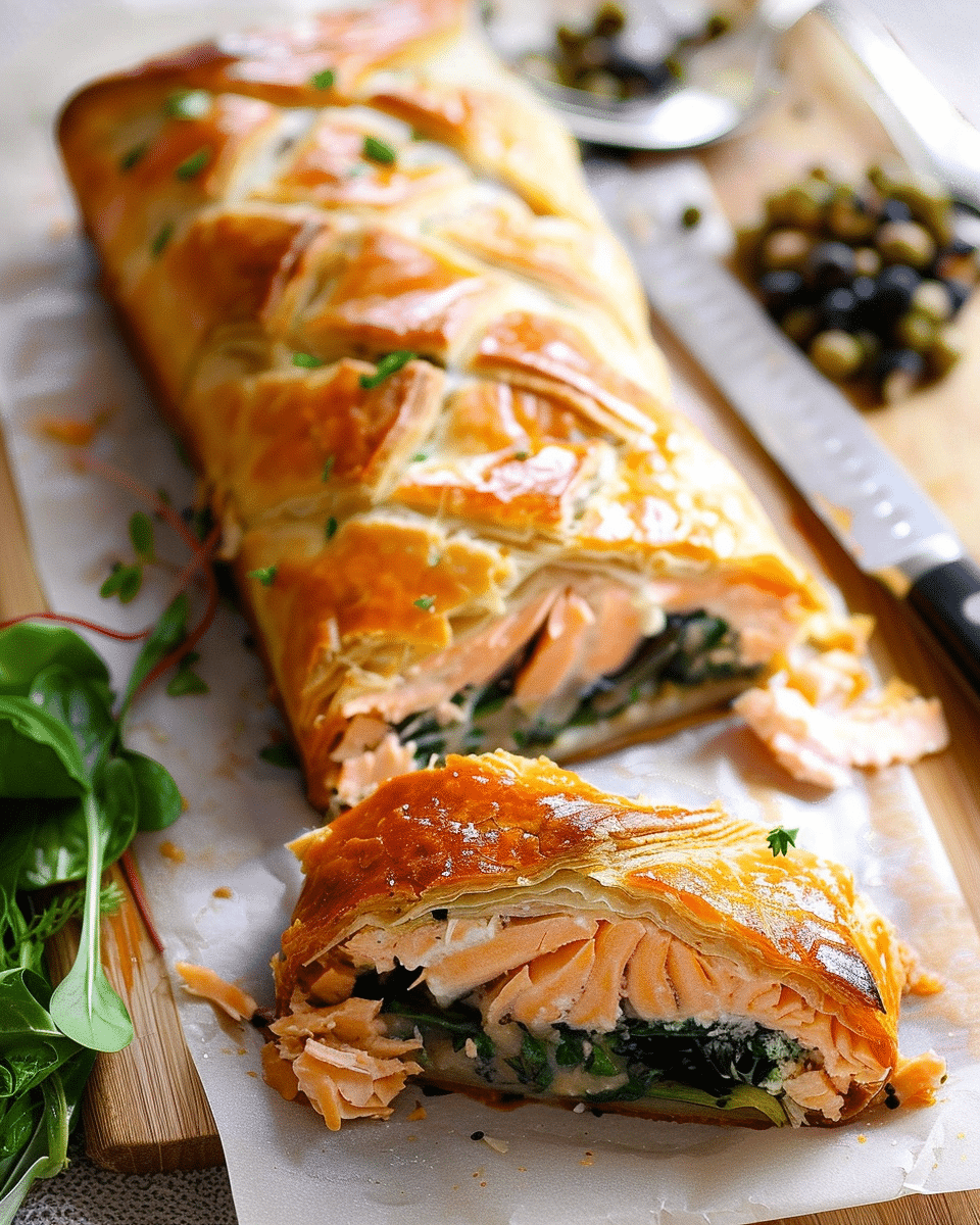 Salmon Wellington is an elegant baked dish made with tender salmon layered over a creamy spinach filling and wrapped in golden, flaky puff pastry for a refined yet approachable main course.