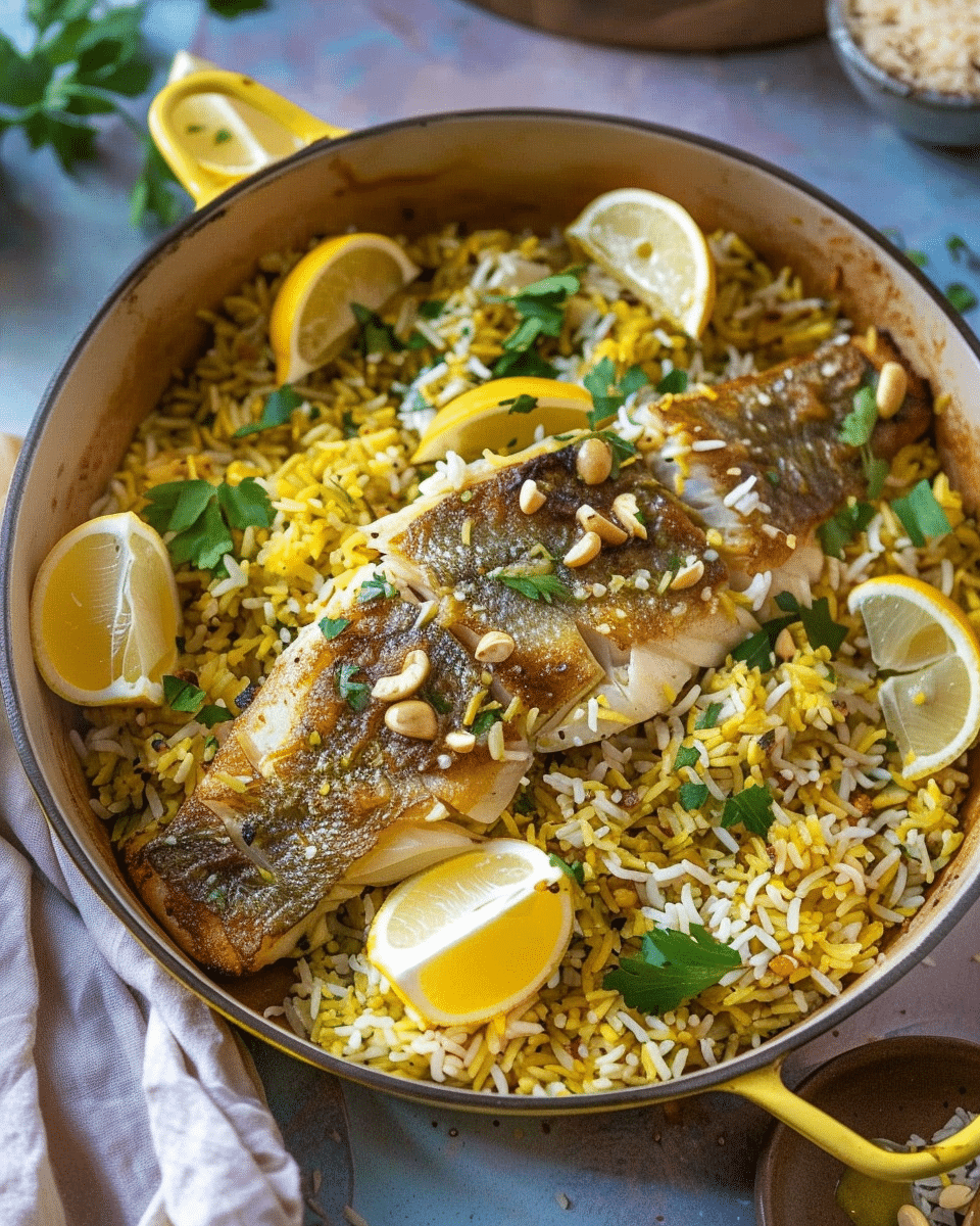 Once done, fluff the rice and carefully remove the fish fillets from the pot. Arrange the fish on a platter, serving the rice alongside or beneath it.