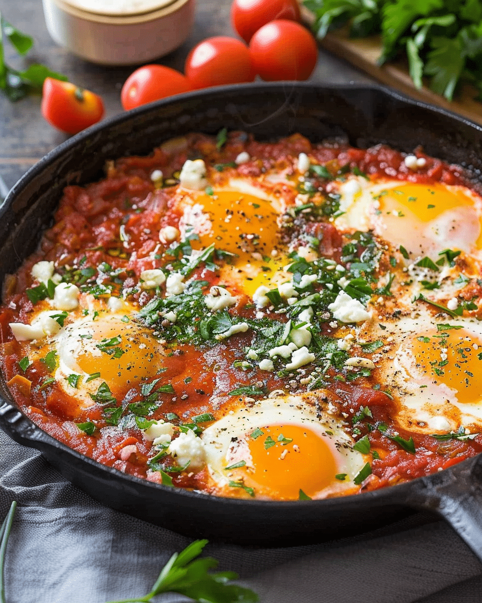 Cheesy Shakshuka: Add crumbled feta or goat cheese just before serving.