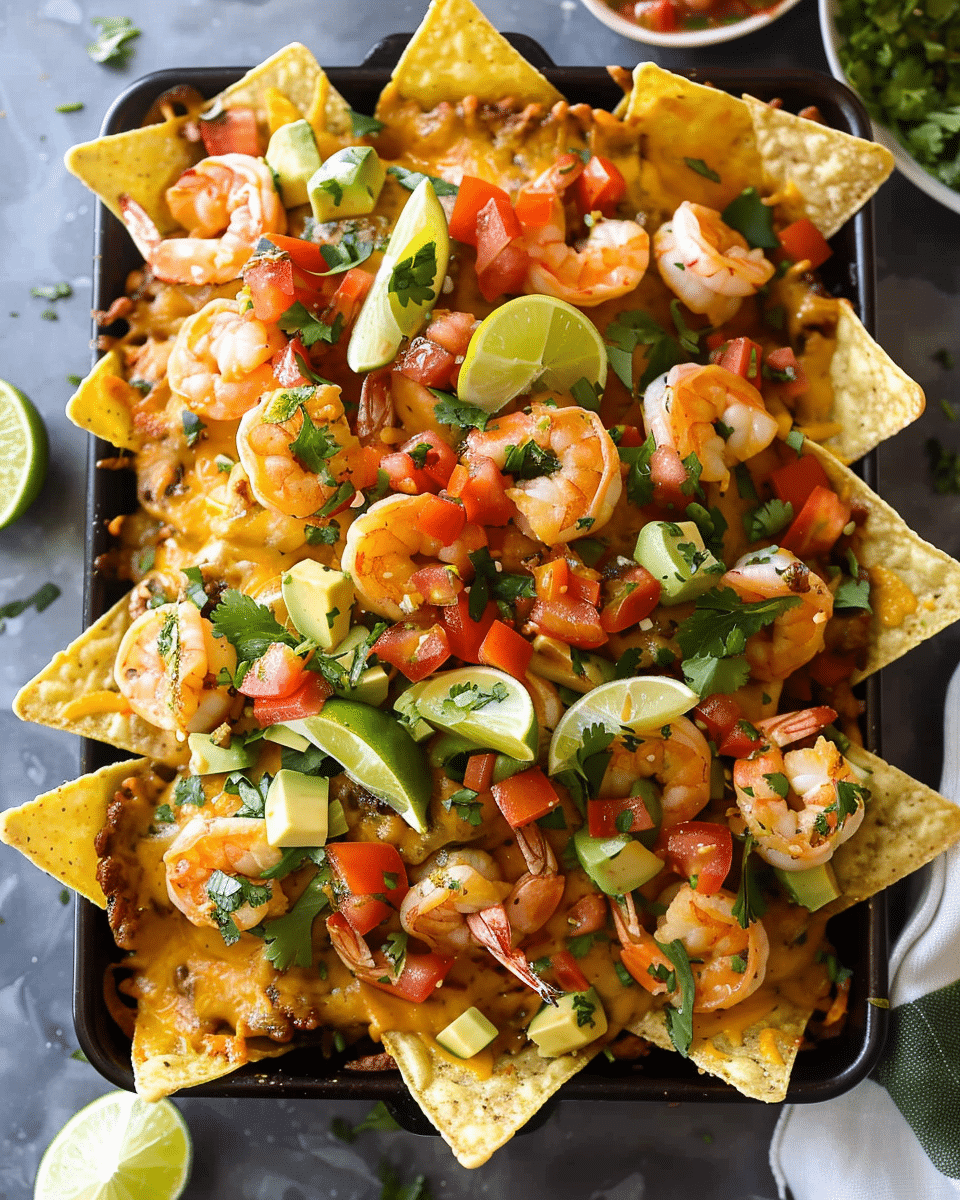 Vegetarian option: Skip the shrimp and load the nachos with more vegetables like roasted corn, bell peppers, or sautéed mushrooms for a vegetarian twist.