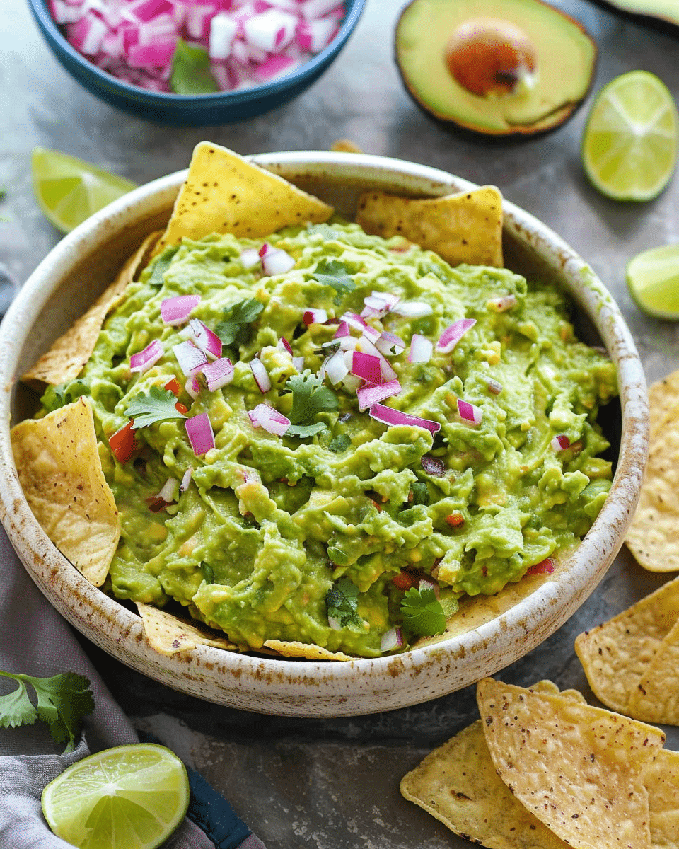 This guacamole recipe keeps things uncomplicated, highlighting the natural creaminess of avocado with just the right amount of acidity and seasoning. It’s made with minimal ingredients, takes less than 10 minutes to prepare, and can be customized to suit your taste. Whether you’re entertaining or just craving a snack, this guacamole is always a hit.