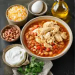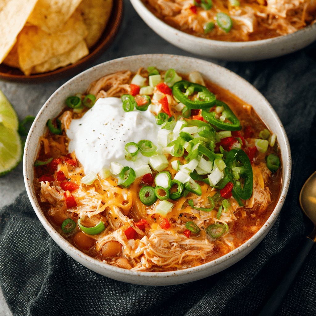Use shredded rotisserie chicken and reduce cook time for a quicker version. Add corn for a touch of sweetness. Stir in ranch seasoning for extra tangy flavor. Swap white beans for black beans. Use ground chicken instead of chicken breasts. Add diced jalapeños for extra heat. Top with crushed tortilla chips for crunch.