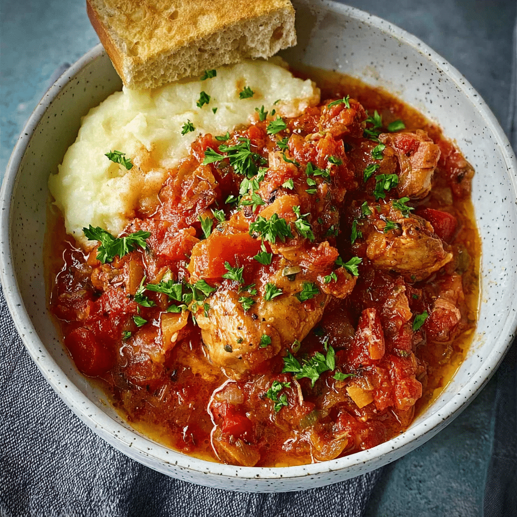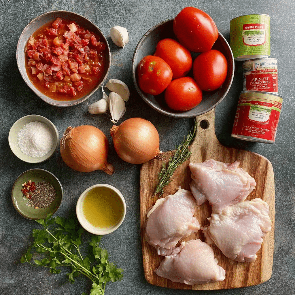 chicken thighs or chicken breasts canned crushed tomatoes tomato paste onion, chopped garlic cloves, minced olive oil dried oregano dried basil salt black pepper paprika chicken broth optional: red pepper flakes for heat fresh parsley or basil for garnish