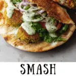 A smash falafel is a regular falafel patty that is gently flattened in a hot skillet to create more crispy surface area and better sauce absorption.