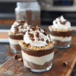S’mores Cheesecake Cups are a no-bake dessert featuring a buttery graham cracker crust, creamy chocolate cheesecake filling, and a fluffy marshmallow topping. Finished with a torch or broiler for that signature toasted flavor, these portable cups bring campfire nostalgia to any party or gathering.