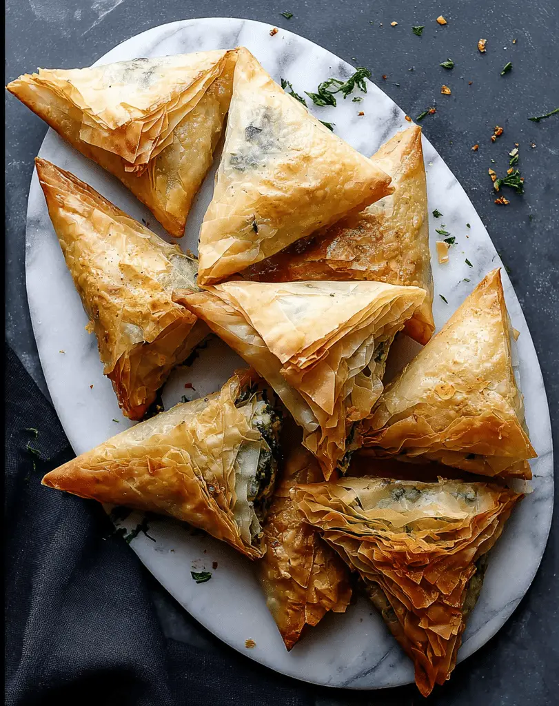 These Spanakopita Triangles are crispy Greek-inspired pastries filled with spinach, feta cheese, and herbs wrapped in flaky phyllo dough. Perfect as appetizers, snacks, or party bites, this easy spanakopita triangles recipe delivers a delicious balance of creamy filling and golden crunchy pastry.