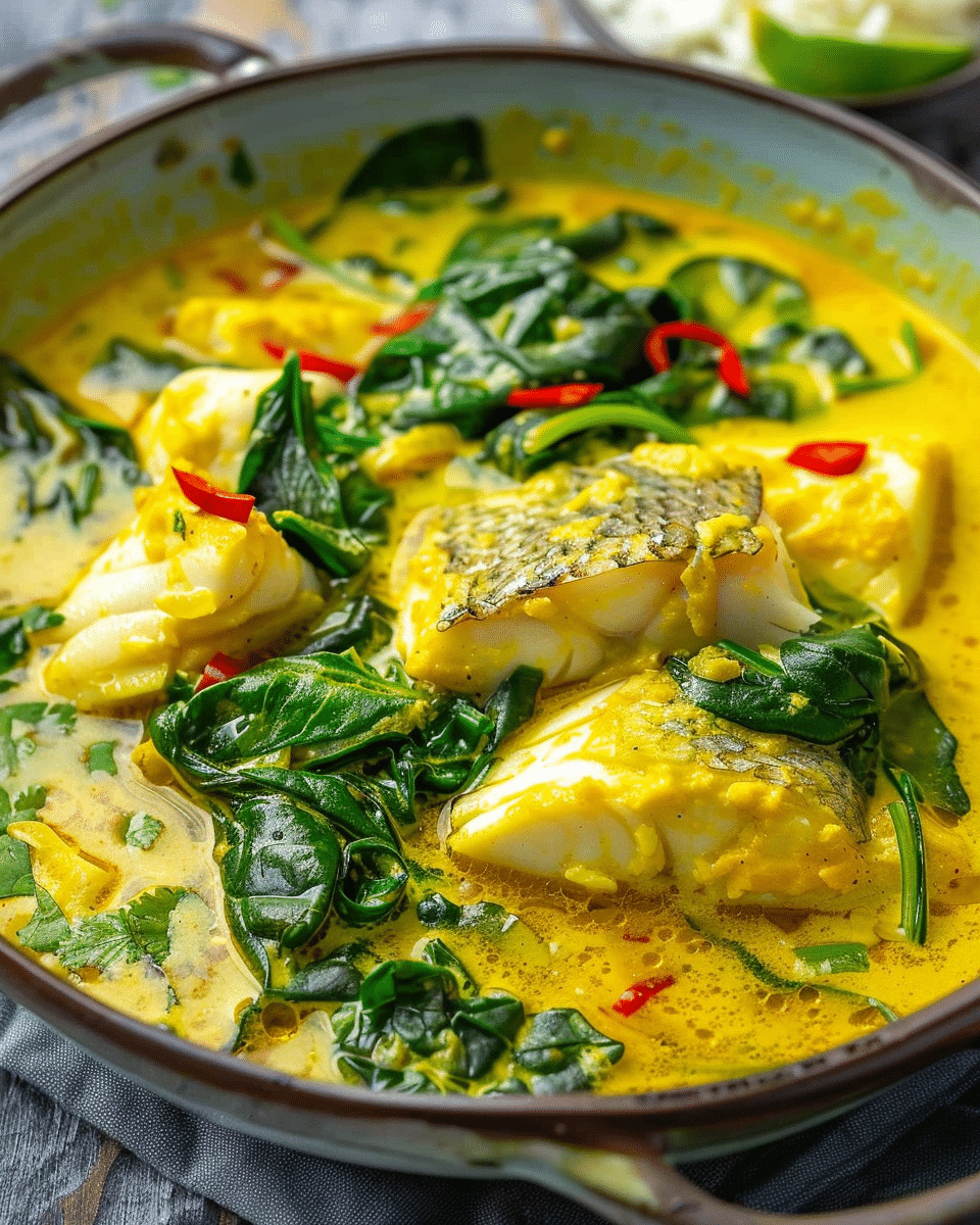 Spinach & Turmeric Fish Curry is a delicious and healthy dish that combines fresh fish, aromatic spices, and nutrient-packed spinach in a creamy, flavorful coconut milk sauce. The rich and vibrant flavors of turmeric and cumin make this curry a standout meal, while the tender fish and spinach make it light yet satisfying. Perfect for a weeknight dinner or a special occasion, this recipe is quick, easy, and packed with goodness. Enjoy it with your favorite sides for a complete and comforting meal!