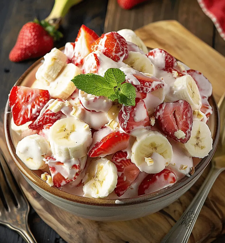 Strawberry Banana Cheesecake Salad is a no-bake dessert made with fresh strawberries, bananas, and a creamy cheesecake-flavored filling. It’s sweet, fruity, and perfect for potlucks, brunches, and summer gatherings.