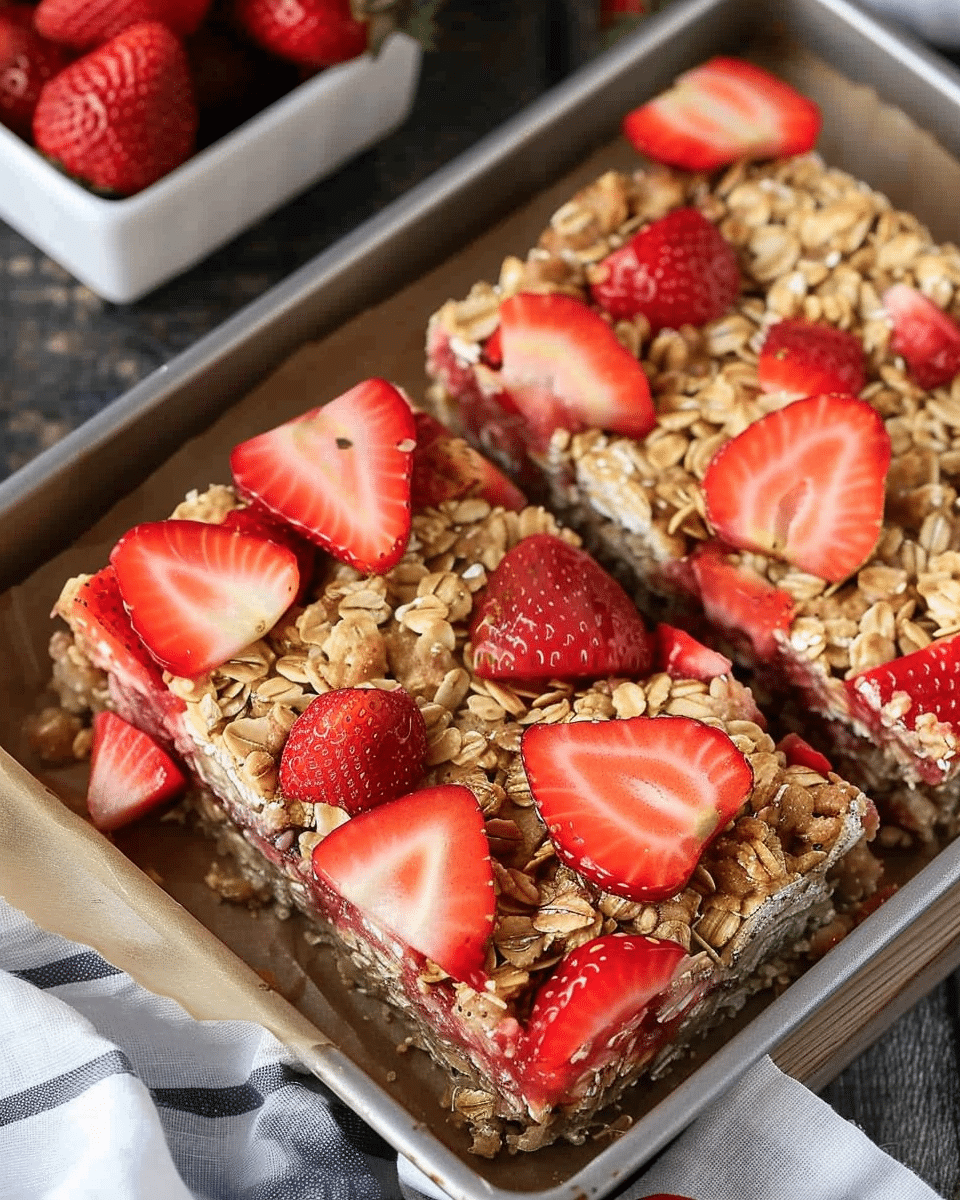 These bars are incredibly simple to prepare and require only basic pantry ingredients. They’re versatile enough to be served as a sweet breakfast option, an afternoon pick-me-up, or a lighter dessert. The combination of a chewy oat base, gooey strawberry center, and crumbly topping is utterly irresistible. Plus, they can be made year-round with fresh or jam-based strawberry filling.