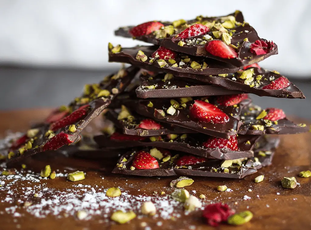 Strawberry pistachio dark chocolate bark is a quick, beautiful, and delicious treat that’s perfect for any occasion. With its rich chocolate base and vibrant toppings, it’s a simple recipe that delivers impressive results every time.