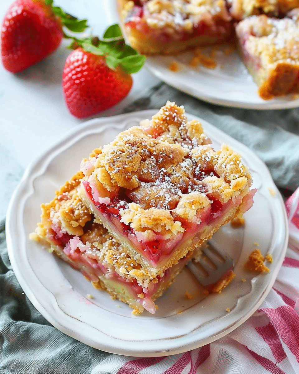 Strawberry Rhubarb Bars are the perfect balance of sweet, tart, and crumbly in every bite. The combination of juicy fruit filling and buttery crust makes them an irresistible dessert that’s sure to please. Whether you’re enjoying them during the spring or anytime you want a fruity treat, these bars will become a go-to recipe. Simple to make and easy to customize, this dessert is a must-try for all fruit bar lovers!