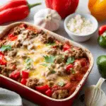 This casserole delivers the taste of traditional stuffed peppers without the extra work. Everything cooks together in one dish, making it simple to prepare and easy to clean up. It’s family-friendly, budget-conscious, and great for leftovers or meal prep.