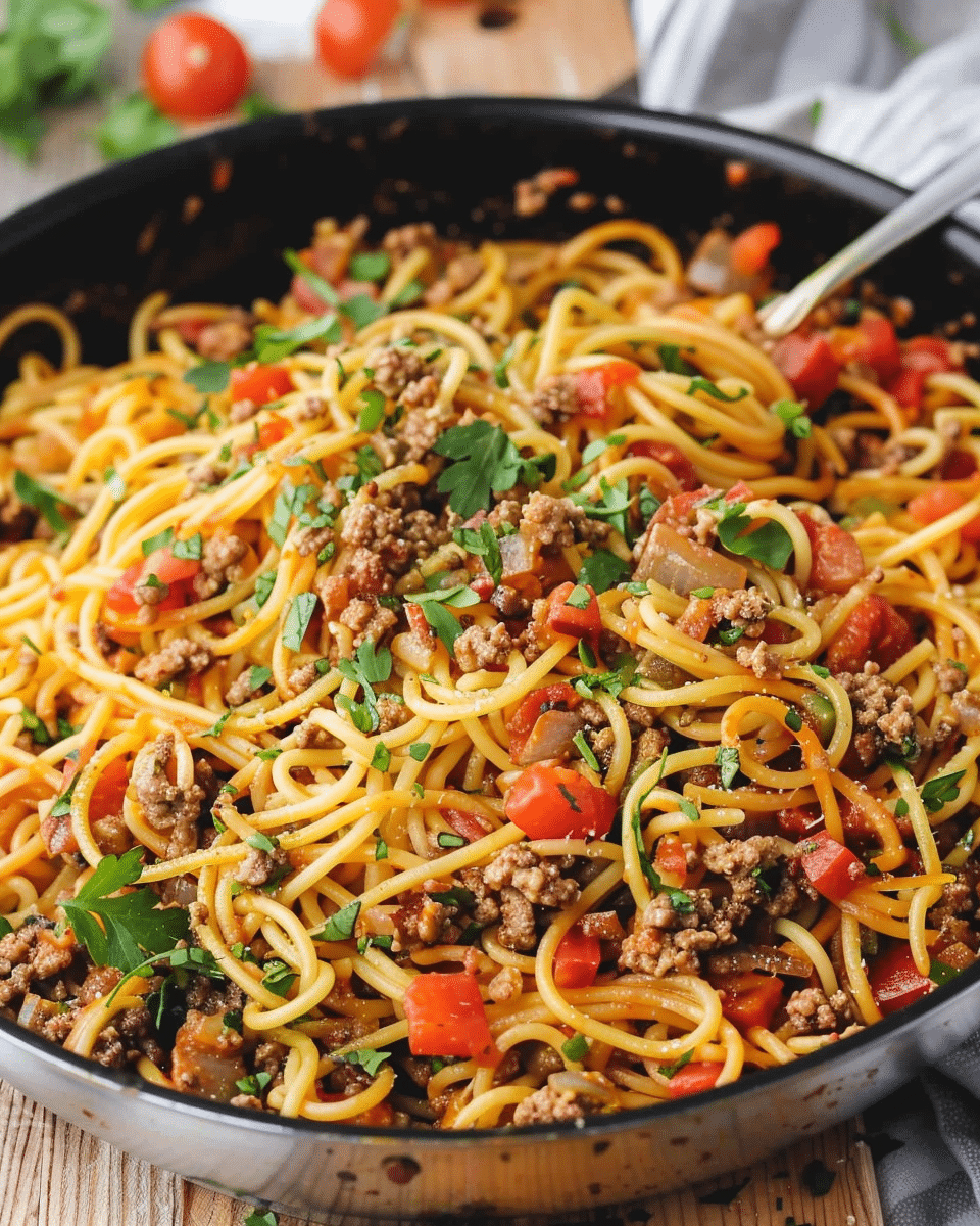Taco Spaghetti is a fun and flavorful fusion dish that combines the bold flavors of tacos with the comforting texture of spaghetti. This casserole-style dish features taco-seasoned ground beef, tomatoes, pasta, and melted cheese, making it a perfect weeknight dinner for the whole family.