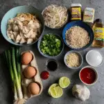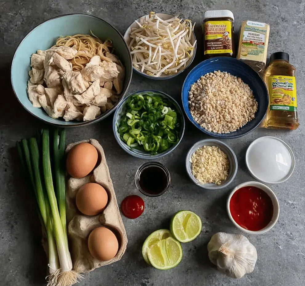 (Tip: You’ll find the full list of ingredients and measurements in the recipe card below.) rice noodles chicken breast eggs garlic bean sprouts green onions peanuts lime wedges soy sauce fish sauce tamarind paste brown sugar vegetable oil salt black pepper