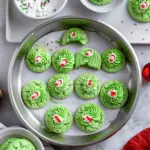 Grinch Cookies are soft, chewy, and vibrantly green sugar cookies topped with a signature red candy heart. Inspired by the beloved holiday character, these festive cookies are perfect for Christmas parties, cookie swaps, and holiday baking with kids.