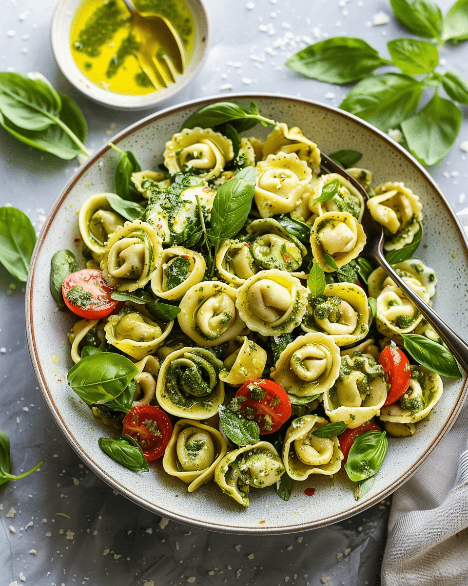 This recipe is a fantastic mix of convenience and flavor. It uses store-bought tortellini and pesto, which cuts down prep time, but still delivers a delicious, homemade feel. It can be served warm or cold, making it versatile for any occasion. With fresh spinach and juicy tomatoes, it’s both colorful and nutritious, and the pesto gives it a herby, garlicky punch that ties everything together beautifully.