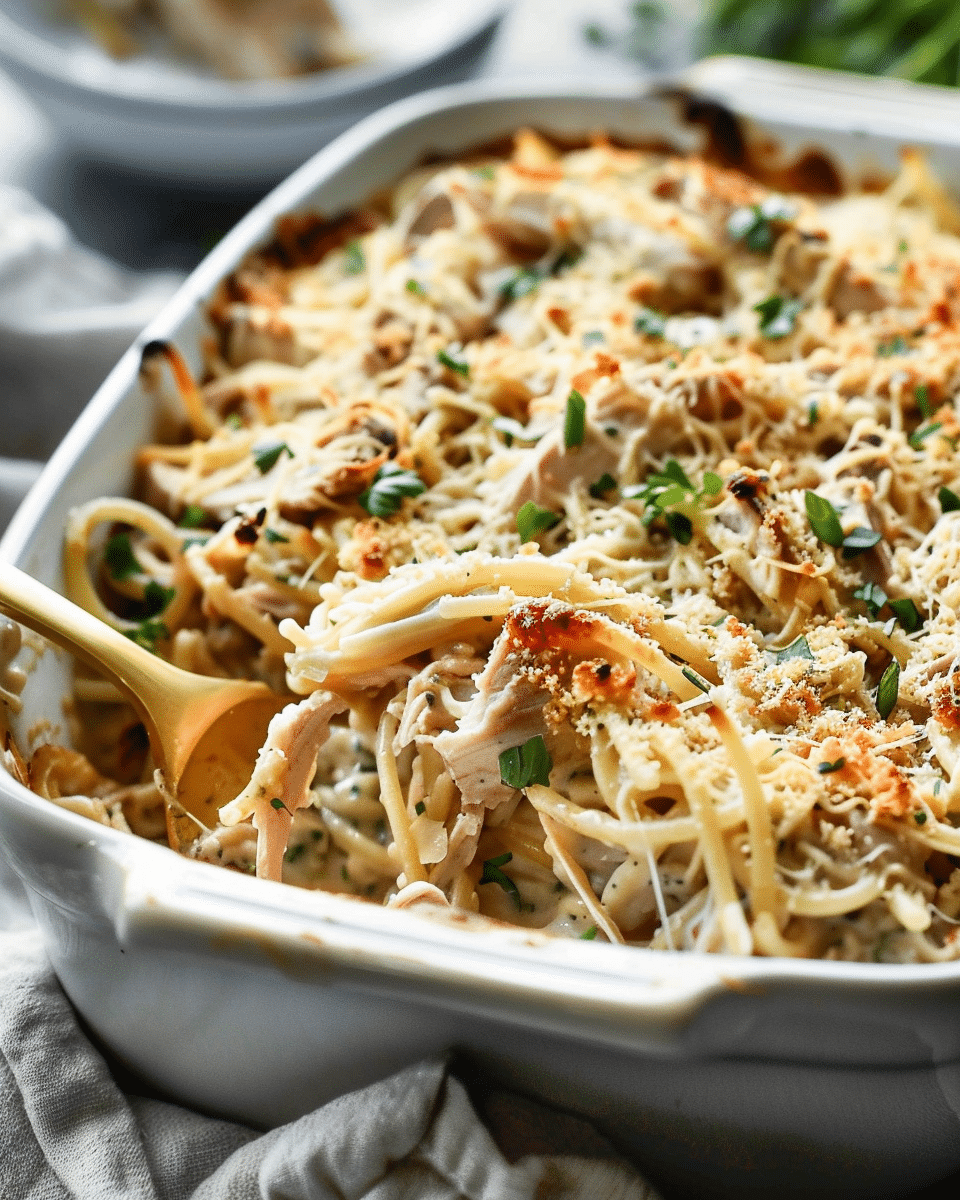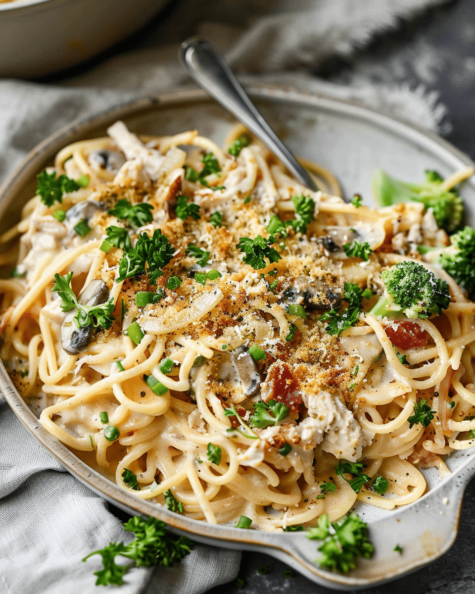 Use rotisserie chicken instead of turkey for a classic chicken tetrazzini.Add vegetables like peas, broccoli, or spinach for extra nutrition.Top with breadcrumbs for a crunchy topping.Can be assembled ahead and refrigerated up to 24 hours before baking.Freezes well before or after baking — thaw in the fridge overnight before reheating.