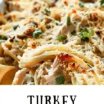 Add cooked turkey and pasta to the sauce and mix until well coated.