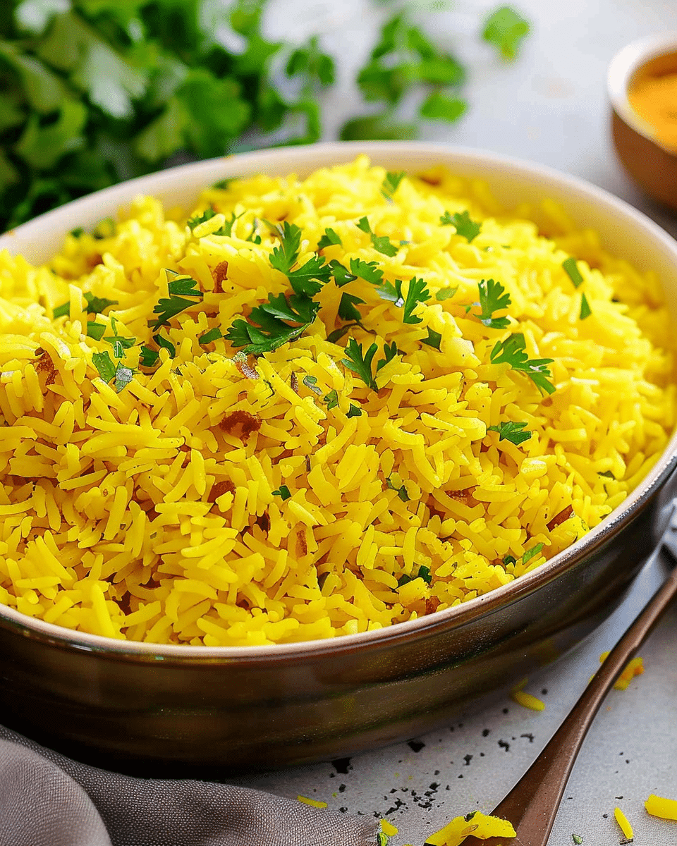 Turmeric Rice is not only beautiful to look at but also packed with flavor. The combination of turmeric, garlic, and onions creates a comforting, aromatic side dish that elevates any meal. Turmeric, known for its anti-inflammatory properties, adds a subtle warmth that complements a wide variety of dishes. It’s a quick and easy recipe that requires just a few ingredients, yet delivers big on taste. Whether you’re serving it with a curry, grilled chicken, or simply with vegetables, this rice is a crowd-pleaser.